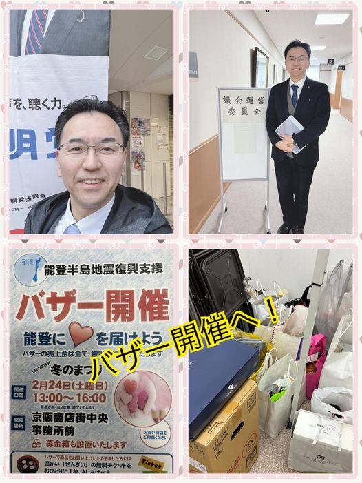 🌠一昨日には議会運営委員会が開催され、来週の21日より本会議.市政方針演説が行われます。⭐️京阪守口市駅東口より朝の駅立ちをスタートしました。24日には、土居の商店街で能登半島地震復興支援としてバザーを開催します。是非お越し下さい!