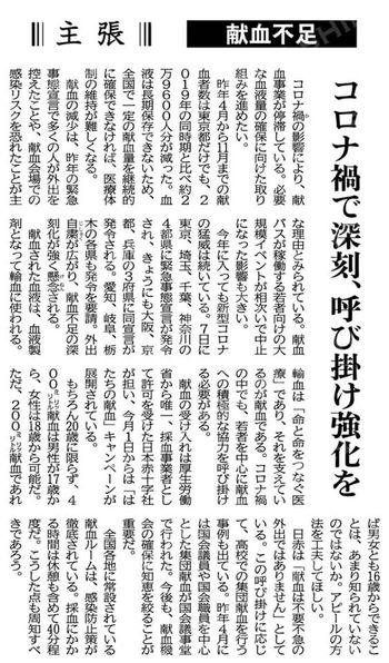 コロナ禍で輸血不足が深刻、呼びかけ強化を!
