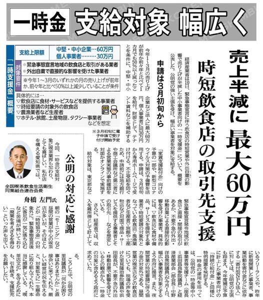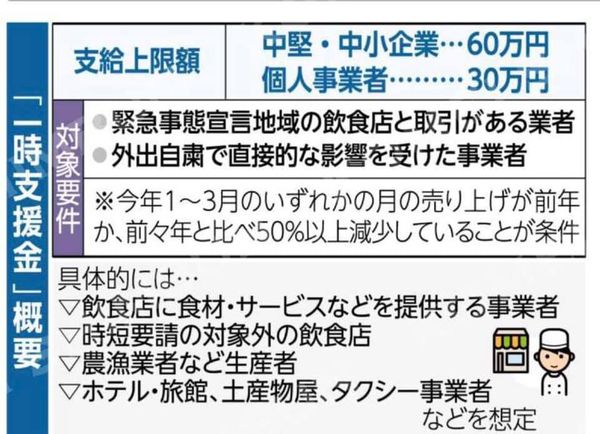 🌠一時金支給対象 幅広く!売上半減に最大60万円.時短飲食店の取引先支援