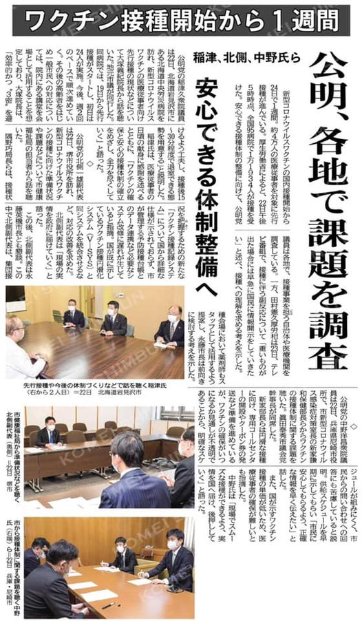 公明、各地で課題を調査(22日午後5時時点で全国95病院で1万1934人が接種を受けた)