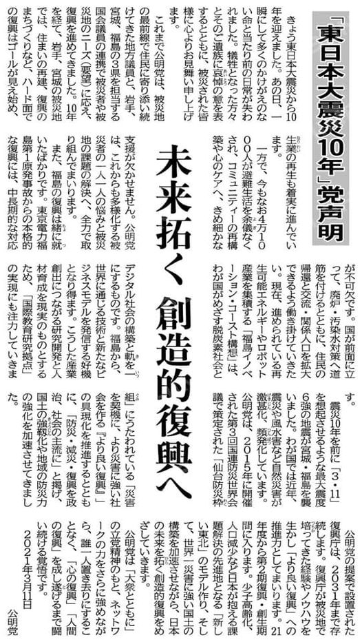 💫党として「防災.減災.復興を政治、社会の主流に」と掲げ国土の強靭化や地域の防災力の強化を加速してきました。今後とも心の復興.人間の復興を成し遂げるまで闘い抜く覚悟であると声明を出しました。