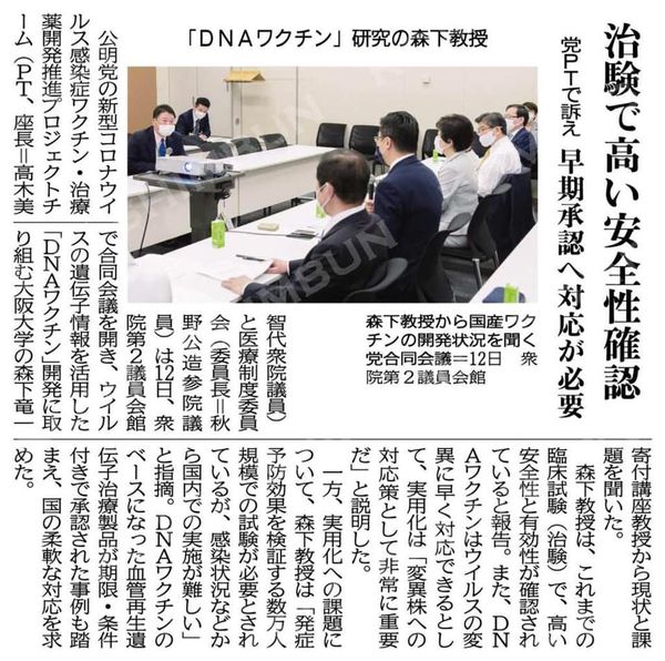 🌠公明党のワクチン治療薬開発推進プロジェクトチームは、「DNAワクチン」開発に取り組む大阪大学の森下教授から現状と課題を聞きました。