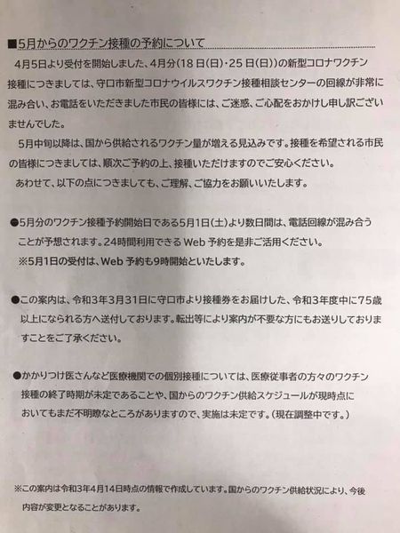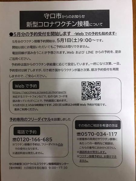 5月分のワクチン摂取予約開始は、5月1日(土)9時?(webの予約と電話の予約0120-166-685があります。)