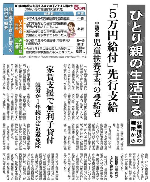 18歳の年度末を迎えるまでの子どもひとりあたり5万円を支給(ひとり親世帯と住民税非課税のふたり親世帯も対象に)