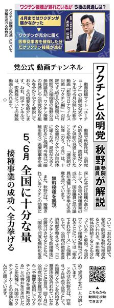 秋野参議院議員がYouTube動画サイトにてワクチン接種の見通しや公明党の取り組みをわかりやすく解説しています。
