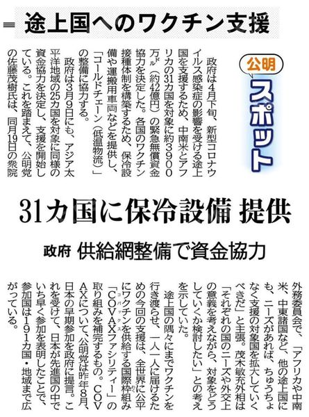 ⭐️公明党の途上国へのワクチン支援は、国際枠組み「COVAXファシリティ」の取り組みを補完するものであり、日本がいち早く参加したことの意義は大きい。