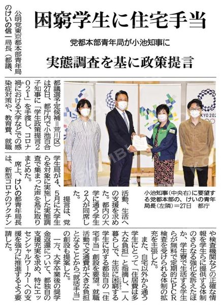 都議が知事に対して「学生政策提言2021」を手渡しました。実態調査を基に幾つもの政策提言が入っています。