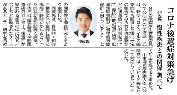 ⭐️伊佐衆議院議員は、新型コロナウイルス感染症から回復した後に一定の割合で見られる後遺症への対応を巡って原因不明の慢性疾患との関係性を研究するように主張しました。