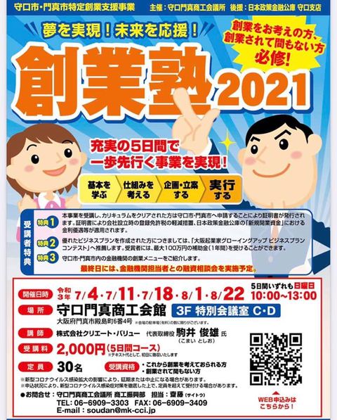 創業塾2021の案内です。守口市で起業を御検討の方は是非ご覧下さい。様々な受講者特典も付いています。