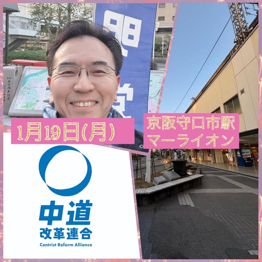 1月19日(月)おはよう御座います!京阪守口市駅マーライオン前より朝の街頭に立たせて頂きました。「中道」とは生活者ファーストであり、国と市の連携が最も大切であることを訴えてさせて頂きました!しっかり頑張って参ります。