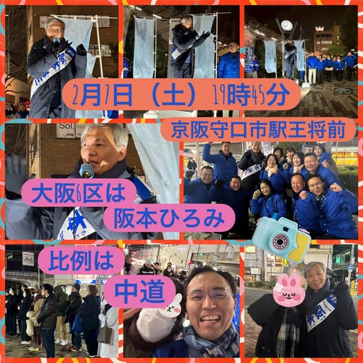 🤩2月7日(土)19時45分より京阪守口市駅王将前にて、選挙戦最後のマイク🎤納めスポット街頭を行いました。