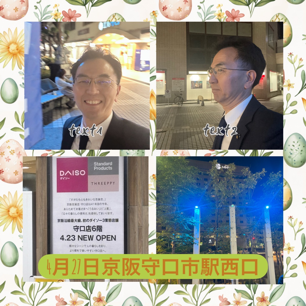 京阪守口市駅マーライオン前にて1時間ほど夜の駅立ちへ!なかなかお会い出来ない形とも会えます!お声掛けありがとうございます。明日もしっかり訪問活動して参ります。