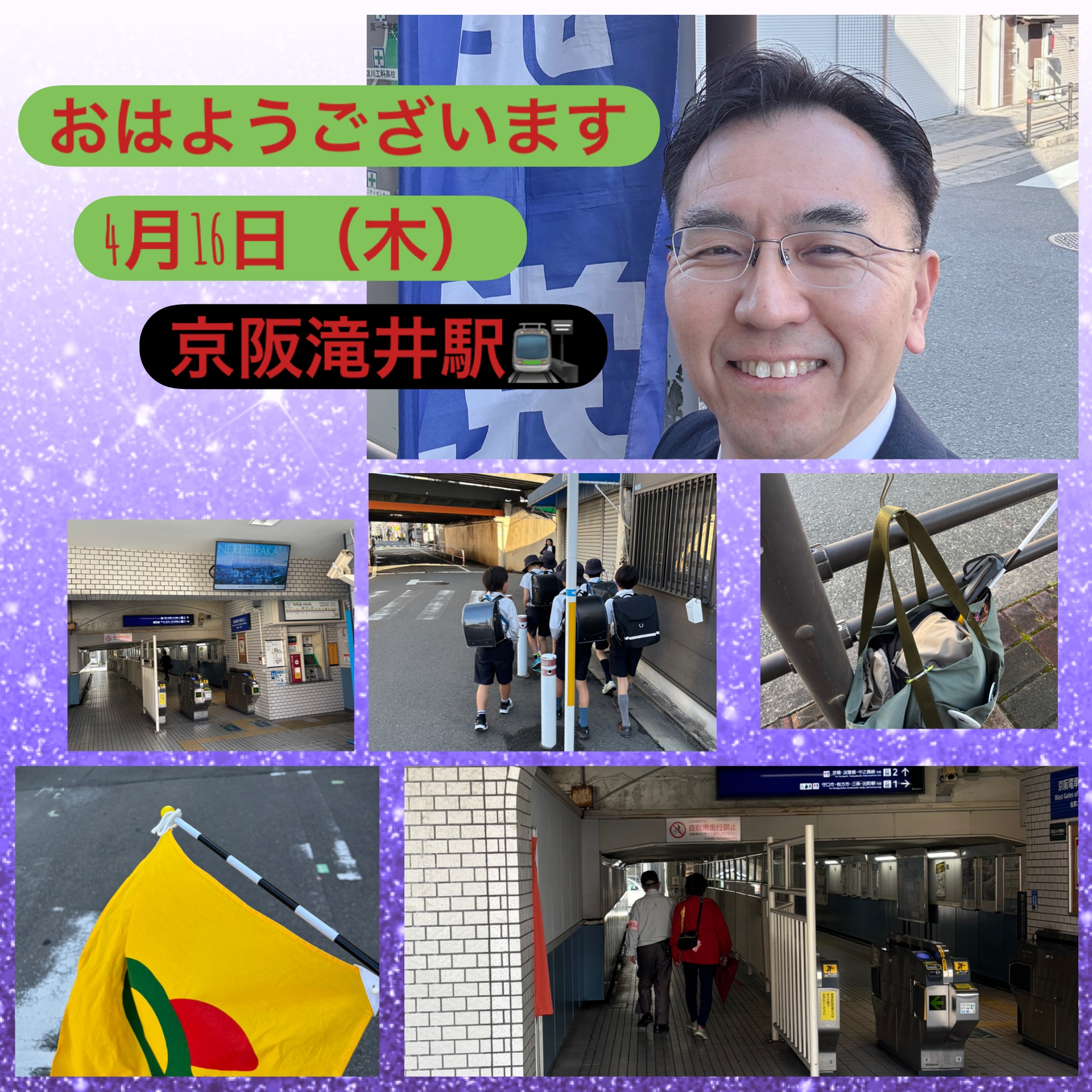 おはようございます! 💫4月16日(木)は京阪滝井駅前より朝の駅立ちをスタートしました。 関西医大の職員また高校生の方が足ばやに改札口を通りすぎて行く中、学生さんがにっこりと挨拶をして…