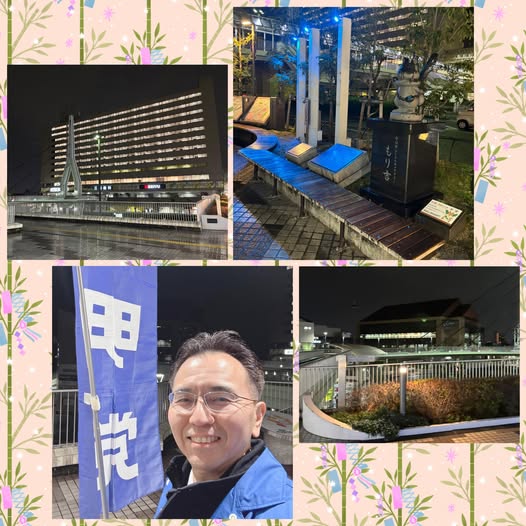✨こんばんは!福本けんいちです。京阪守口市駅京阪百貨店前にて夜の駅立ちに。🌟もり吉もライト🔦アップされていますね。雨がシトシトと降る天候ですが、気をつけてお帰りください。