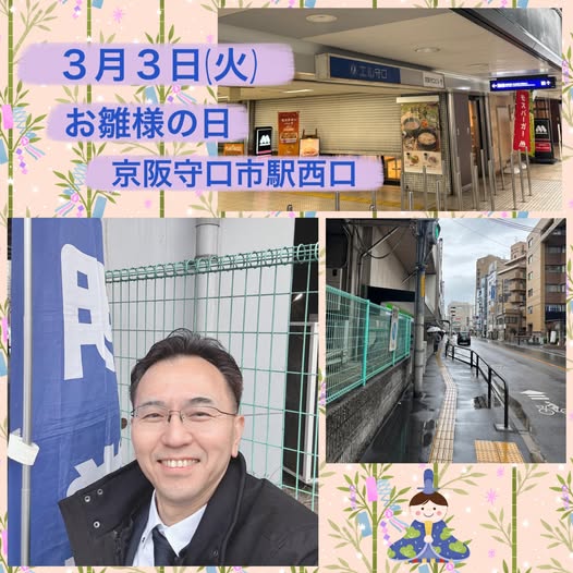 🌟3月3日(火)おはようございます!今日は一日雨模様ですね。京阪守口市駅西口より朝の立礼をスタートしました。🤩出勤の方や学生さんがにっこり微笑んで頂きます。ありがとうございます😊⭐️これから団会にて代…