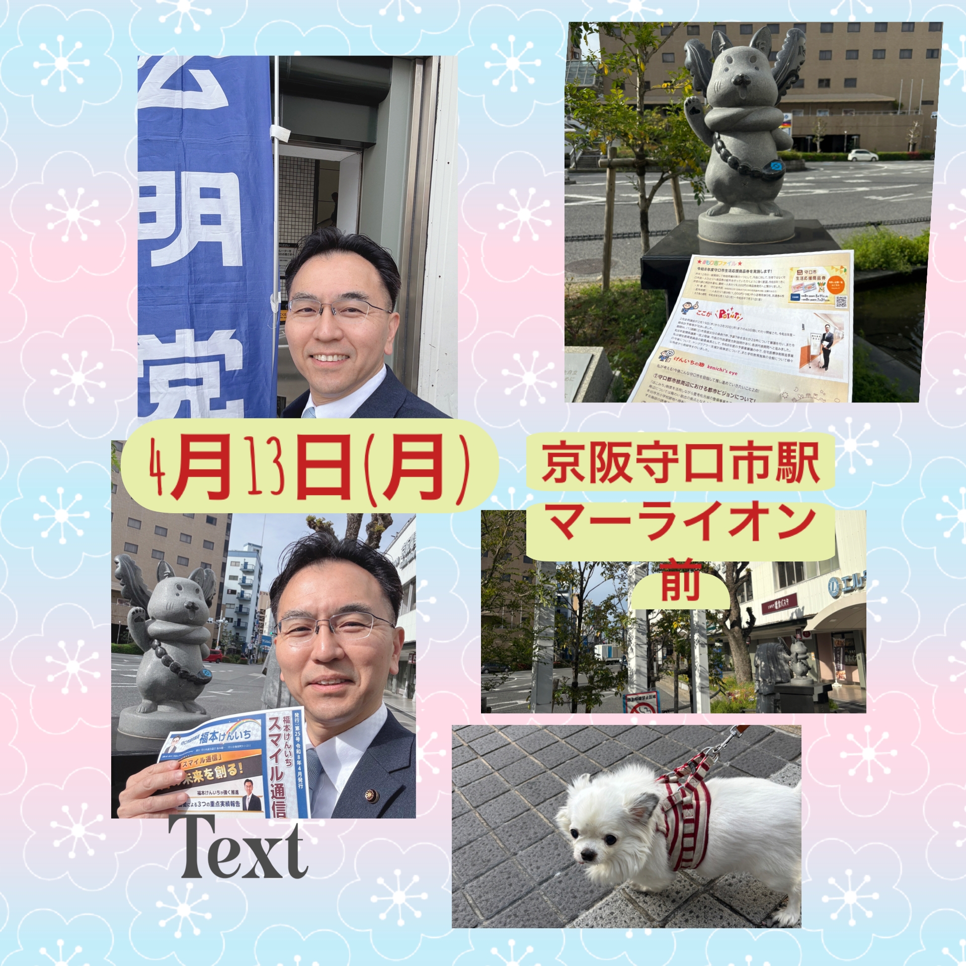 おはようございます!4月13日(月)京阪守口市駅マーライオン前よりスタートしました。 💫爽やかな朝の出発です。可愛いワンちゃんをパチリと。 ✨今後、一昨日完成したスマイル通信第25号を…