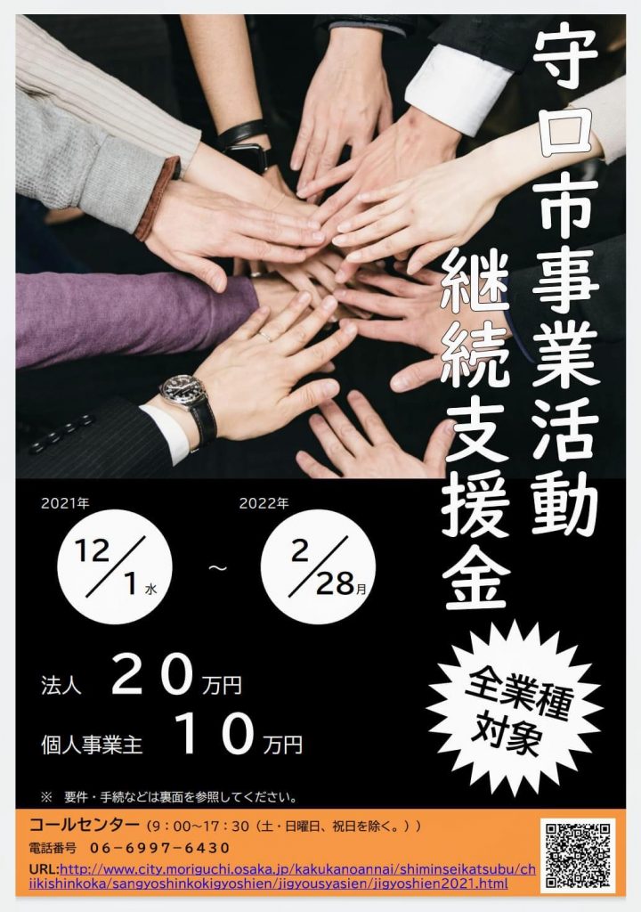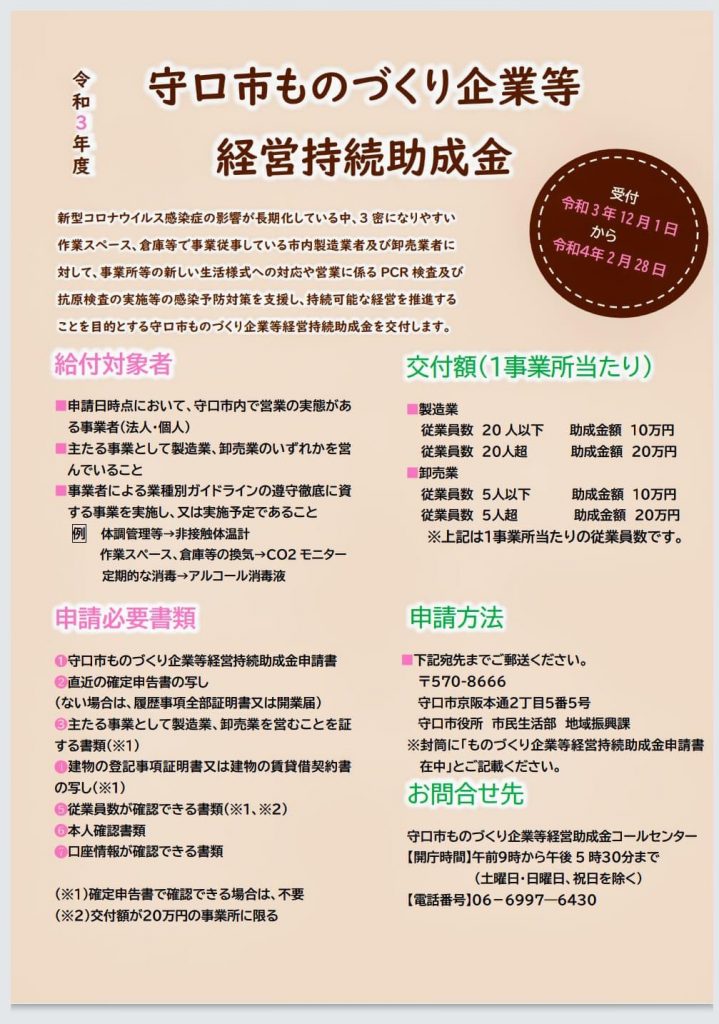 🏢守口市ではコロナ禍で売上の減少等で打撃を受けた市内中小企業者への支援策がホームページに掲載されました!