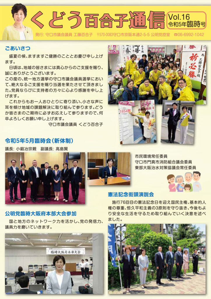 くどう百合子通信 Vol.16が完成いたしました。ボタンをクリックしますと、ダウンロード可能なPDFファイルが開きます 。