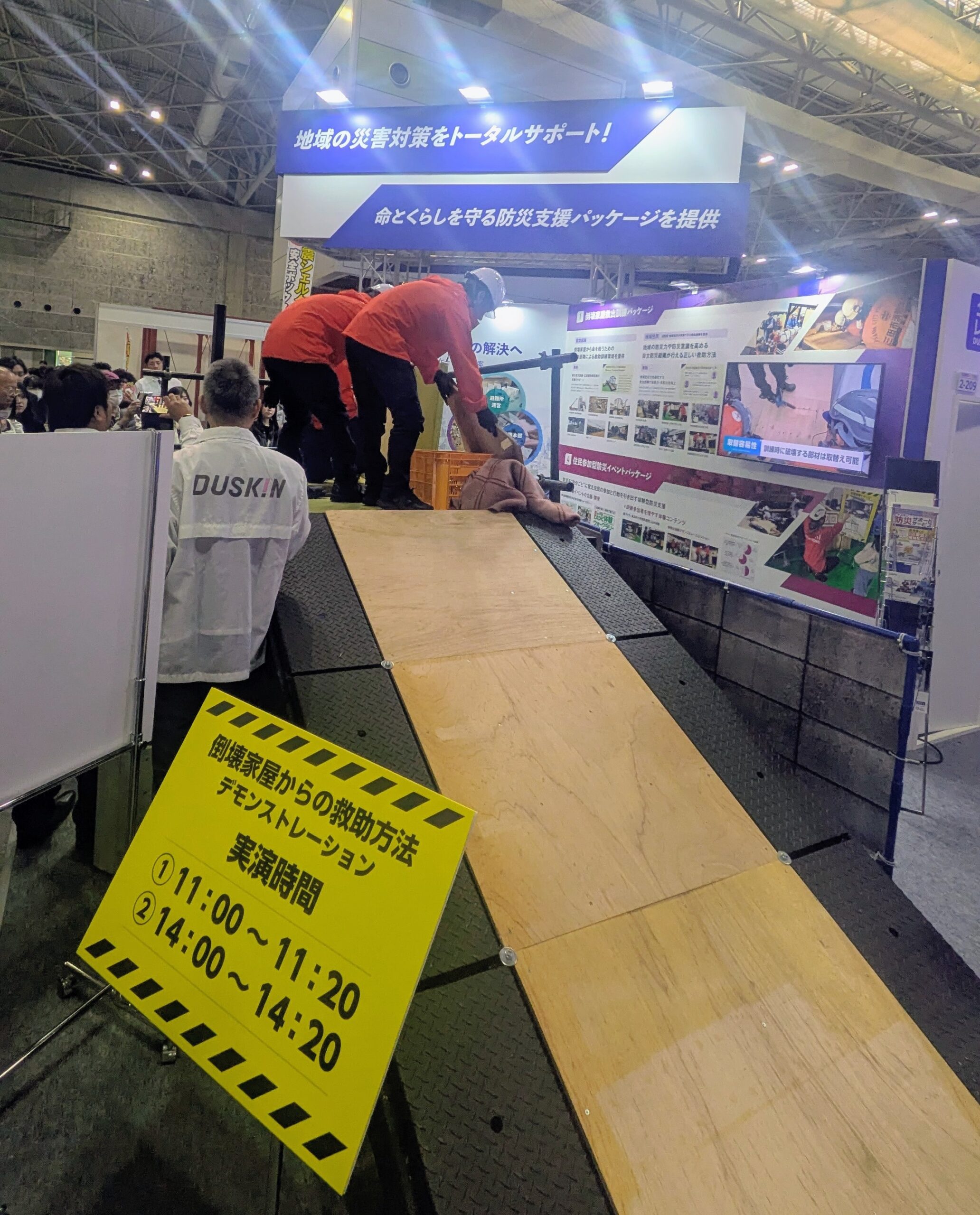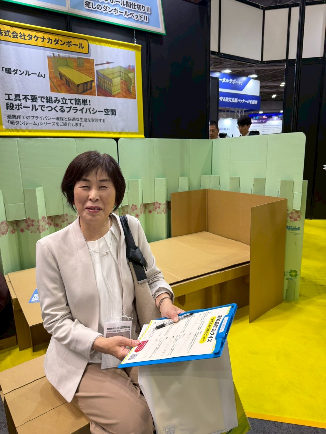 毎年すぐに目に飛び込んでくるのが防災先進県高知の企業です。段ボールベッドも進化しています。実演や体験コーナーも多くの人だかりです。