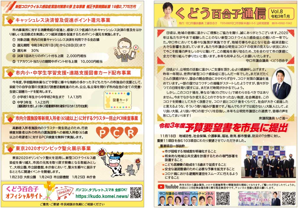 くどう百合子通信 Vol.8が完成いたしました。 画像をクリックしますと、ダウンロード可能なPDFファイルが開きます。