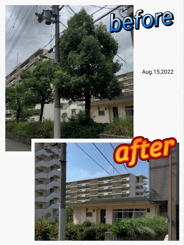 地域住民の方より「山之内住宅敷地内の樹木が、電線に接触しており、台風シーズンをむかえ不安 」とのご相談がありました。