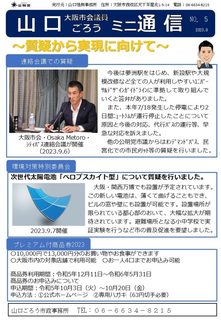 【質疑で未来のエネルギーを推進】大阪市会・Osaka Metro・シティバス連絡会議で質疑。夢洲駅などのユニバーサルデザイン整備を要望。さらに次世代太陽電池「ペロブスカイト」の普及についても提案しました。